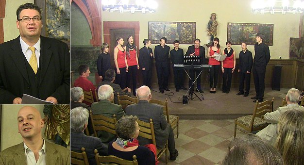 Ansprachen und Ehrungen verdienter Bürger Links oben Bürgermeister Rainer Sens, unten Dr. Ulrich Spiegelberg, rechts "Joice of Voice". (Fotos: Hubert Richter)(hr) Im Kapitelsaal des katholischen Pfarramts lud die Stadt Hirschhorn heute zum offiziellen Neujahrsempfang mit Ehrungen verdienter Bürgerinnen und Bürger ein. Weil der Bürgersaal durch Fastnachtsveranstaltungen belegt war, wich man auf den Klosterberg aus.