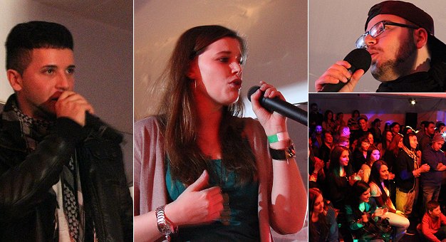 V.l. der Heidelberger Rapper D-Sad, Battle-Siegerin "Encima", Moderator Hakan Özdemir und ein Blick in den gut gefüllten Besucherraum. (Fotos: Hubert Richter)