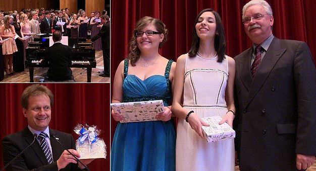 Alle 88 Schülerinnen und Schüler der gymnasialen Oberstufe, die zu den Prüfungen angetreten waren, haben ihr Abitur bestanden (wir berichteten). Insgesamt erreichten sie einen Notendurchschnitt von 2,4. Die beiden Besten mit einem Schnitt von 1,0 waren Nicole Zimmermann und Tradite Neziraj. Nicole Zimmermann verfehlte den maximal erreichbaren Punktestand von 900 Punkten gar nur um knappe 4 Punkte. Beide erhielten für ihren Erfolg Preise der Stadt Eberbach, die Bürgermeister Peter Reichert zusammen mit HSG-Schulleiter Helmut Schultz überreichte.