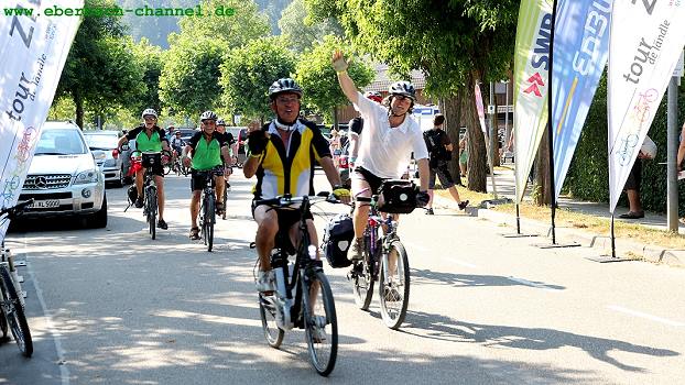 An die 2.000 Teilnehmer der Tour waren am Vormittag in Weinheim gestartet. Trotz sommerlicher Hitze mit Temperaturen von mehr als 35 Grad kamen die meisten Radler nach einer letzten gemeinsamen Pause in Mossbrunn gegen Abend wohlbehalten in Eberbach an. Mit Applaus wurden sie am Radweg im Sportgebiet in der Au empfangen. Dort warteten auf sie zunächst Erfrischungen in Form einer Wasserspritzanlage der Freiwilligen Feuerwehr und kühlenden Wasserschwämmen. Frischmachen konnten sich die Sportler auch in einem eigens zum Duschen aufgestellten "Showertruck". Zusammen mit den Tourveranstaltern des Südwestrundfunks und der EnBW hatten die Eberbacher unter Federführung des Kulturamts ein großes Fest vorbereitet. Am Nachmittag spielte die Musikkapelle "Kleiner Odenwald" aus Allemühl, und gegen Abend zog Jongleur "Jeremy" Klein und Groß in seinen Bann. Die eigentliche Etappenparty startete um 19 Uhr mit den Bands "Schlagerfeld" und der "Spider Murphy Gang" auf der großen Showbühne, vor der ein riesiger runder Pavillon aufgebaut war. Um 22 Uhr war schon wieder Schluss, nachdem die Stars aus Bayern mit Hits wie "Skandal im Sperrbezirk" für ausgelassene Stimmung gesorgt hatten. Denn die Radler brauchten ihren Schlaf für die nächsten Etappen, die an insgesamt sieben Tagen von Weinheim bis Stockach am Bodensee führen. Heute Morgen machten sich die Radler nach dem Frühstück auf in Richtung Bad Mergentheim. Übernachtet hatten viele von ihnen im Matratzenlager der Hohenstaufen-Sporthalle, wo 500 Schlafplätze vorbereitet waren, oder in Zelten auf dem Rasendreieck neben dem Fußballstadion. Einige Teilnehmer waren auch in umliegenden Hotels untergebracht, wofür Shuttlebusse eingesetzt waren.