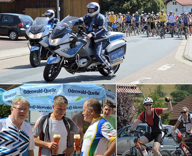 Mudaus Bürgermeister Dr. Norbert Rippberger und Landrat Dr. Achim Brötel hatten zuvor die rund 260 Teilnehmer begrüßt. Eskortiert von der Polizei und vom Roten Kreuz setzte sich der lange Zug in Bewegung. Erster Halt war am Gasthaus "Zur Mühle" im Oberhöllgrund, wo Wirt Rainer Holzner und seine Mannschaft Erfrischungen anboten. Auch der neu gewählte Waldbrunner Bürgermeister, Markus Haas, der sich bei dieser Gelegenheit als Nicht-Radfahrer outete, begrüßte die Teilnehmer vor Ort. In rascher Fahrt ging es dann über Gaimühle ins Sensbachtal. Bald war die Sporthalle in Unter-Sensbach erreicht. Viele fleißige Helfer vom TSV, Landfrauenverein, Feuerwehr und Gemeindeverwaltung sorgten dafür, dass die Kohlenhydrat- und Flüssigkeitsdepots schnell wieder aufgefüllt werden konnten. Bürgermeister Egon Scheuermann stellte seine Gemeinde vor. Unter den zahlreichen Teilnehmern waren u. a. Manfred Heiss (ehemaliger Bürgermeister von Sensbachtal) sowie Heike Siefert (Sensbachtal) und von Anfang an immer dabei Horst Lorenz aus Darmstadt und Horst Jahn aus Beerfelden. Von Unter-Sensbach aus war dann zunächst die Steigung zum Sensbacher Friedhof zu bezwingen, bevor in Olfen eine Kaffeepause anstand. Abschluss des ersten Tages war die Rudi-Wünzer-Halle in Wald-Michelbach, wo die Radler gegen 17 Uhr eintreffen wollten. Der zweite Tag führte von Wald-Michelbach über Höchst ins Maintal nach Mömlingen und Bürgstadt.