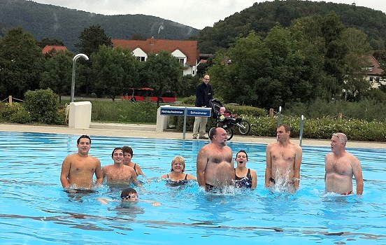 Neun Mutige der DLRG Eberbach genossen noch ein letztes Mal die Freuden eines langen, leeren Schwimmbeckens. Ein wenig Überwindung kostete es schon, trotz der 15 Grad Außentemperatur ins Wasser zu steigen. Eine wohlige Entschädigung brachten die 28 Grad Wassertemperatur, die ein ausgedehntes Schwimmen und einige Sprünge vom Drei-Meter-Turm gestatteten.
