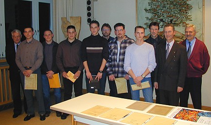 Abschlussfeier an der Gewerbeschule - Keiner fiel durch (Foto:Peters)(hr) (Quelle:Eberb.Ztg.) Ein außerordentlich erfolgreicher Jahrgang wurde gestern abend von der Gewerbeschule Eberbach verabschiedet. Ausnahmslos alle 38 Absolventen, ein laut Schulleiter Günter Engelhardt "relativ seltenes" Ereignis, haben die Abschlussprüfung bestanden. Ein Fliesenleger beendete seine Ausbildung nach zweieinhalb Jahren sogar vorzeitig. Sechs Maschinenbau-, sieben Industrie- und neun Kraftfahrzeugmechaniker, zehn Industrie- und drei Energieelektroniker, zwei Elektroinstallateure und besagter Fliesenleger sind mit ihrem Berufsschulabschluss dem Gesellen- oder Facharbeiterbrief und damit der ersten beruflichen Qualifikation ein großes Stück näher gekommen. Sieben von ihnen wurden von Schulleiter Engelhardt (2.v.r.) für hervorragende Leistungen mit Buchpreisen oder einem Lob bedacht. Bester war Thomas Scheuermann, Maschinenbaumechaniker bei Oskar Dilo Maschinenfabrik (Eberbach), mit einem Notendurchschnitt von 1,5. Aber auch die Leistungen von Industrieelektroniker Maik Spatz ,Firma Semecs (Eberbach), Kfz-Mechaniker Nicolas Andres, Firma Filsinger (Eberbach), Maschinenbaumechaniker Sascha Kolb, Firma Oskar Dilo, Fliesenleger Marc Luksch, Firma Back (St.Leon-Rot), und der beiden Industrieelektroniker Sebastian Kotz, Firma Semecs, und Jochen Siefert, Firma Oskar Dilo, können sich sehen lassen. Markus Sprenger erhielt eine Dankurkunde für freiwillige Mitarbeit bei der Ausstellung "Ausbildung und Kunst". Eine Powerpoint-Präsentation von Jürgen Findeklee erinnerte an diese Gemeinschaftsaktion von Gewerbeschule, Kulturlabor und Galerie ARTgerecht. In Anwesenheit zahlreicher Vertreter von Kreis- und Kommunalpolitik, Schulen und Ausbildungsbetrieben verabschiedete Schulleiter Engelhardt die Absolventen mit einem Gedankenanstoß von Golo Mann: "Glück setzt Aktivität voraus". Elternvertreterin Renate Konradi und ihre Stellvertreterin verbanden via Overheadprojektor aussagekräftige Landschafts- und Stimmungsbilder mit guten Wünschen für den weiteren Lebensweg. Andreas Viehöver von der Musikschule Eberbach umrahmte die Verabschiedung auf dem E-Piano.