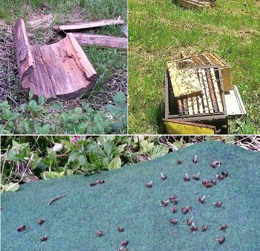 Ein Bienenvolk wurde geöffnet, so dass es hineinregnete. Ein weiteres Bienenvolk, bestehend aus drei Magazinbeuten, wurde samt Bienen und Wabenmaterial kopfüber den Abhang hinuntergestoßen. Ein Bienenvolk, das in einer Klotzbeute (ausgehöhlter Baumstamm) wohnte, zerschellte an Abgrund und wurde komplett zerstört. Der entstandene Schaden konnte noch nicht beziffert werden.