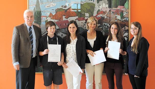 Bundeswettbewerb Fremdsprachen 2014 Stolze Sieger, v.l.: Schulleiter Helmut Schultz, Jonas Bender, Julia Naßutt, Stephanie Bloch-Klein, Karolin und Kerstin Klingmann. (Foto: privat) (bro) (pm) Im Januar haben in ganz Baden-Württemberg über 350 Schülerinnen und Schüler am Bundeswettbewerb Fremdsprachen teilgenommen. Inzwischen stehen die Sieger des diesjährigen Einzelwettbewerbs fest. Auch das HSG stellt Preisträger.