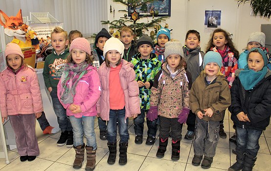 Kindergartenkinder dekorieren den Christbaum in der Geschäftsstelle Nord (Foto: privat)(bro) (kb) Am 4. Dezember besuchten die baldigen Schulanfänger/-innen des evangelischen Kindergartens „Arche Noah“ die Geschäftsstelle Eberbach-Nord. Die Kinder hatten selbst gebastelte Sterne und Christbaumkugeln zum Schmücken dabei.