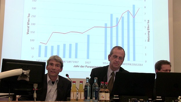 CDU bläst zur Jagd auf die Forstverwaltung - Gewinnmaximierung contra Nachhaltigkeit Manfred Robens vom Kreisforstamt (l.) und Siegfried Riedl von der Stadtförsterei stellten die Forstbetriebspläne vor. (Foto: Hubert Richter)(cr) Zurückhaltung aus Nachhaltigkeitsgründen übt die Stadt Eberbach bei der Holznutzung in ihrem Wald. Angesichts knapper Kassen kommt das im Gemeinderat nicht bei allen gut an, wie sich am Donnerstag bei der öffentlichen Beratung des Forsthaushalts für 2015 zeigte.