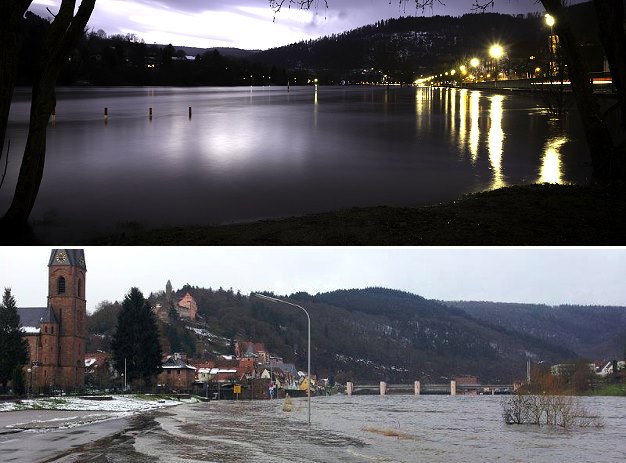 In Hirschhorn stand die Uferstraße entlang der Stadtmauer komplett unter Wasser (Bild unten). Zehn bis 20 Zentimeter mehr, und das Wasser hätte sich voraussichtlich von unten in den Keller des Rathauses gedrückt. Am Chateau-Landon-Platz und am Sportplatz kratzten die braunen Fluten kräftig. Der Scheitelpunkt am Abend lag bei etwa 5,90 Metern.