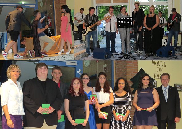 Durch das Programm führten Janina Lenz aus der 10. Klasse und der Neuntklässler Lukas Seisler. Bevor im Foyer die Gäste zu einem Sektempfang eingeladen wurden, verabschiedeten sich die jetzt "Ehemaligen " mit dem Lied "Another Brick in the Wall", begleitet von der Schulband und dem Schulchor der Klassen 9 und 10 unter der Leitung von Lehrer Ekkehart Bock.