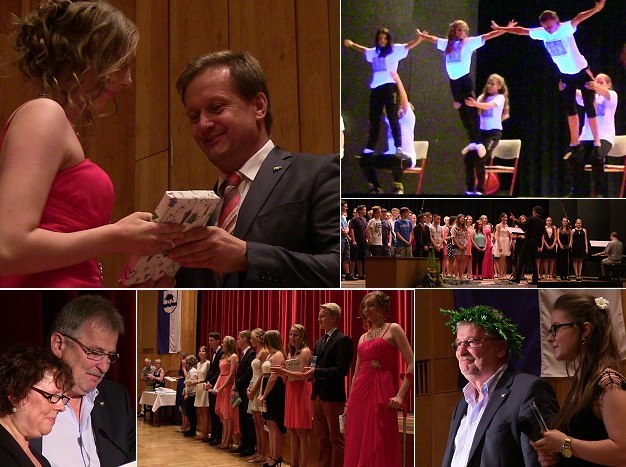 Zeugnisausgabe in feierlichem Rahmen mit Unterhaltungsprogramm O.l. Ehrung der Jahrgangsbesten Julia Zimmermann durch Bürgermeister Peter Reichert. O.r. die Artistik-AG und der Oberstufenchor. Unten v.l. Rektorin Regine Sattler-Streitberg und Konrektor Rolf Schieck, die Ehrung der elf besten Absolventen und Rolf Schieck mit Lorbeerkranz und Moderatorin Ann-Cathrin Heckmann. (Fotos: Hubert Richter)