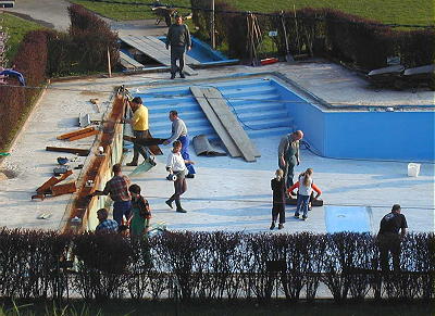 Drei Tage haben zahlreiche Helfer unter der Anleitung und Regie von Horst Obenauer gearbeitet. Es konnten alle Platten rund um das Bad herausgehoben und gereinigt werden. Die Überlaufrinne ist ebenso entfernt worden, wie die nahezu 20 Jahre alte blaue Folie, die seither den Beckenboden und die Wände zierte. Die nächsten Tage will die BSH noch nutzen, um das Spendenkonto noch aufzufüllen. Immerhin sind die geplanten Sanierungsarbeiten mit nahezu 60.000 Euro veranschlagt. Wie bereits gemeldet, muss die BSH der Stadt Beerfelden diese Summe als Investitionskredit bis zum nächsten Haushaltsjahr vorstrecken. Über 40.000 Euro sind bereits auf das bekannte Konto bei der Sparkasse Odenwaldkreis in Erbach eingegangen. Dabei konnte sich die BSH über eine Vielzahl von namhaften Spenden erfreuen. Vor allem aber von der Möglichkeit, ein Darlehen vorzuschießen, habe viele Bürger und Geschäftsleute Gebrauch gemacht. Jeder der noch mittels einer Spende oder einem Darlehen mit dazu beitragen möchte, dass am kommenden Montag (8.) auch die Summe von 60.000 Euro tatsächlich an die Gemeindekasse überwiesen werden kann, hat noch die Möglichkeit auf das Konto Nr.: 100 517 929, BLZ 50851952, bei der Sparkasse Odenwaldkreis die notwendigen Formalitäten vorzunehmen.