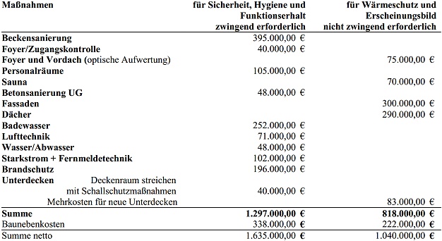 Unterm Strich wird der unbedingt notwendige Sanierungsaufwand auf gut 1,6 Millionen Euro geschätzt. Wollte man zusätzlich Wärmeschutzmaßnahmen an Fassade und Dach in Angriff nehmen und das Erscheinungsbild des Bades verbessern, käme noch einmal gut eine Million hinzu (alle Beträge ohne Mehrwertsteuer, da die Stadtwerke vorsteuerabzugsberechtigt sind).