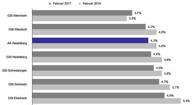 Frühjahrsbelebung am Arbeitsmarkt beginnt  Arbeitslosenquoten im Februar. (Grafik: Bundesagentur für Arbeit)(bro) (aa) Von Januar auf Februar ist die Zahl der arbeitslosen Menschen im Heidelberger Agenturbezirk um 576 auf 15.692 Personen gesunken. Gegenüber dem Vorjahresmonat ist die Arbeitslosigkeit um 826 niedriger. Die Arbeitslosenquote ist um 0,1 Prozentpunkte zurückgegangen und beträgt jetzt 4,3 Prozent.