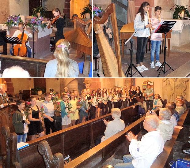 Mit einfühlsamer Klavierbegleitung (Tamina Stadler) konzertierte Antonia Lechner bravourös auf der Viola mit dem Finalsatz aus J. Chr. Bachs Concerto c-moll. „Moonlight Shadow“ von Mike Oldfield (Blockflöten: Kiara Albert, Elias Heinzmann) und „Sound of Silence“ von Paul Simon (Blockflöten: Finia Brettel, Melina Fuchs), mit warmen schönem Blockflötenklang vorgetragen, leiteten eine nachdenkliche Abendstimmung ein. Einen schönen Dialog der Flöten ergab auch das Duo Julia Debo und Salome Kerle mit „Lustig“ (U. Staeps), und barocke Flötenklänge entfalteten sich mit dem Allegro aus Telemanns Second Livre de Duo Nr. 3, gekonnt vorgetragen von Julia Stangl und Greta Böing. Klavier vierhändig, eine Domäne früherer Hausmusik, ist heute selten zu hören. Mit R. Schumanns „Gartenmelodie“, vorgetragen von Elisa und Hannah Enger, zog Romantik pur in die Klosterkirche. Musik für Klavier gab es auch mit Beethovens „Für Elise“, auswendig gespielt von Anna Thommes, die sich hier den Tücken des Stückes stellte sowie dem ausdrucksstarken zweiten Satz aus Aram Chatschaturjans Sonatine für Klavier, gespielt von Johannes Thommes. Haydn’sche Gemütlichkeit zog mit dem Menuett aus dessen D-Dur Trio für Violine, Viola und Cello ( Mirjam Enger, Antonia Lechner, Elisa Enger) ein, und glanzvoll wurde es mit einer Sonate in der gleichen Tonart von B. Marcello für Blockflöte (Mara Fuchs) und Cello (Elisa Enger) und dem Spinett als zusätzliche Continuobegleitung. Mozarts Andante con Variazioni für zwei Flöten (Querflöte Hannah Enger, Lehrerin C. Böing) ergab wiederum einen schönen Dialog der Querflöten mit der Variation zwischen sprudelnd zu getragenen Passagen. Als ob die Vögel auf den Querflöten (Anna Thommes, C. Böing) mitzwitscherten klang es bei der variationsmäßig umschriebenen Arie des Papageno –„Ein Mädchen oder Weibchen“- mit der schon Mozart seine Zuhörer entzückte. Harfe in der Klosterkirche klingt, als ob die Engel dort mitspielten. So nahm A. Wann mit der Reverie von M. Grandjany gleich die Zuhörer auf diese musikalische Reise mit. Zusammen mit ihrem Bruder Andreas auf der Trompete gab es mit „Chariots of Fire“ (Vangelis), nochmals ein besonderes Klangerlebnis in der Klosterkirche. Mit „The Lord bless you and keep you“ (J. Rutter) sang sich Matilda Zipp mit ihrer schönen Mädchenstimme in die Herzen der Zuhörer, und damit endete ein Ausklang, der wieder einmal die Zuhörer begeisterte.