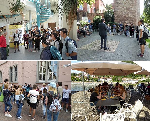 Nach einer Stärkung mit Brötchen und Getränken ließ der Stadtführer die Geschichte der Stauferstadt Eberbach an markanten Punkten der Innenstadt lebendig werden. Der auf Englisch gehaltene Vortrag fand bei den Jugendlichen reges Interesse.