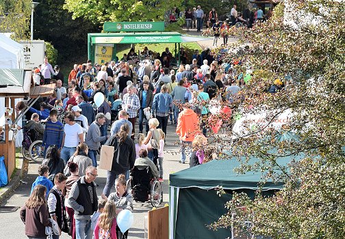 Golden der Herbst - bunt das Fest Sonne satt: Viel Betrieb herrschte beim traditionellen Erntedank- und Herbstfest der Johannes-Diakonie in Schwarzach. (Foto: Michael Walter)(bro) (mw) Eigens für das traditionelle Erntedank- und Herbstfest der Johannes-Diakonie am Standort Schwarzach zeigte sich der Himmel gnädig. Er bescherte den zahlreichen Besuchern und Standbetreibern für einen Tag Sonne satt, Motto: Golden der Herbst, bunt das Fest. Entsprechend gut war die Stimmung rund um Schwarzbach Schule, Schwarzacher Werkstätten, Haus „Sonnenhalde“, Jugendfarm und Reithalle. Schon früh am Tag mussten fleißige Helfer den Weg zu den weniger werdenden freien Parkplätzen weisen, voll besetzt war von Anfang an das „Westerbähnle“, das trotz eines zwischenzeitlich stotternden Motors kontinuierlich seine Runde drehte.