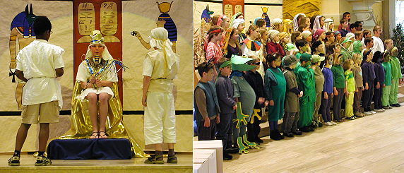 Die Kulissen hatte Barbara Menges mit altägyptischen Darstellungen zwischen Sanddünen stilgerecht entworfen, die Regie führte Sibylle Muff, die es mit sicherer Hand schaffte, die wuselige Schar zu bändigen. Eileen Seipp, Julia Hoftstätter und Jochen Müller erzählten im Wechsel die bekannte biblische Geschichte vom Findelkind Moses, das die Israeliten aus der Sklaverei befreit. „When Israel was in Egypts Land“ klang es aus der Orchesterecke, als sich der Chor zum Sklavenlied aufstellte: „Wir sagen ‚nein‘ zur Sklaverei!“ Dank Achim Plagges profunder Nachwuchsarbeit, klang nichts ängstlich und unsicher, alle Kinder waren ganz bei der Sache. In einem Wiegenlied sangen Oliwia Karasek und Luisa Menges solo und ließen ebenso aufhorchen wie Priska Cimbal, Frauke Stupperich und Vivian Schneider im Fröschelied. Die biblischen Plagen waren natürlich für einigen Spektakel gut. Hüpfende Laubfrösche, schwirrende Fliegen und gefräßige Heuschrecken heizten dem hartnäckigen Pharao ein. Jonatan Cimbal verkörperte ihn in überzeugender Montur, dass es eine Freude war. Den Helden der Geschichte, Mose, spielte und sang Felix Seibert, der in den Nummern „Passahlied“ und „Vertrauenslied“ seine schon recht ausgeprägte, charakteristische Gesangsstimme gekonnt einzusetzen wusste. Weitere Highlights boten Birgit Beisel, die im „Viehpestlied“ ihrer geliebten Kuh Babette nachtrauerte, Luisa Menges, die als Mirjam den Freudentanz im Schlusslied anführte oder Florian Herkert, der Gottes Stimme (selbstverständlich von der Kanzel herab) ertönen ließ. Natürlich kam auch die Action nicht zu kurz. Mit Cityrollern stellte die furchteinflößende ägyptische Streitmacht den Israeliten nach und wurde vom Meer verschlungen. Dabei konnte sich Achim Plagge stets auf sein Orchester verlassen. Michael Jouvenal blies eine recht agile Posaune, die einen Spiritual anführen oder wie ein Frosch quaken konnte. Iris Scherer, Simone Spiller und Alexander Schmidt übernahmen den Streicherpart. Auch chromatische Passagen oder Tremoli im Passahlied waren für sie kein Problem. Frederik Galm (Gitarre) und Philipp Köhler (Schlagzeug) sorgten für den rechten Rhythmus, wobei etwa ein Schlagzeugsolo, das einen Hagelschauer darstellte, schon professionelles Niveau erreichte. Jakob Wieder ließ das Schlusslied „Lobe den Herrn“ über seinen Bässen grooven, dass selbst Glenn Miller zufrieden gewesen wäre, und Andreas Viehöver nahm dem Dirigenten die Klavierarbeit so gekonnt ab, dass jener freie Hand hatte, was den Chorleistungen sehr zugute kam. Am Ende wurden alle Kinder in Gruppen präsentiert, danach die Solisten, schließlich Sibylle Muff (Regie) und Barbara Menges, die auch für die Requisiten zuständig war. Der Applaus steigerte sich und erreichte Sturmesstärke als zum Schluss der Name des künstlerischen Leiters, Achim Plagge fiel. Nur eine Wiederholung des Finales konnte die Wogen glätten.