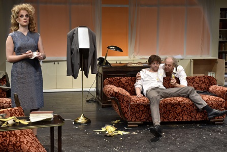 „Mondlicht und Magnolien“ werden „Vom Winde verweht“ Miss Poppenghul (Sina Weiß), auf dem Sofa Victor Fleming (David Meyer) und David O. Selznick (Stefan Holm) in Aktion (Foto: Peter Empl/BLB)(ak) Die Badische Landesbühne gastierte am vergangenen Donnerstag in der Eberbacher Stadthalle mit „Mondlicht und Magnolien“ von Ron Hutchinson.