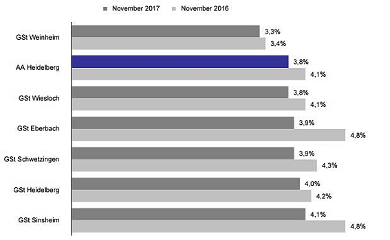 Goldener Herbst auf dem Arbeitsmarkt Arbeitslosenquoten im November. (Grafik: Bundesagentur für Arbeit)(bro) (aa) Von Oktober auf November ist die Zahl der arbeitslosen Menschen im Heidelberger Agenturbezirk um 326 auf 14.186 Personen gesunken. Gegenüber dem Vorjahresmonat ist die Arbeitslosigkeit um 941 niedriger. Die Arbeitslosenquote beträgt 3,8 Prozent, im Vorjahresmonat lag sie bei 4,1 Prozent.