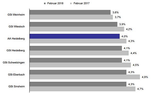 Schulabgänger sollten sich jetzt schon Gedanken über berufliche Perspektiven machen Arbeitslosenquoten im Februar. (Grafik: Bundesagentur für Arbeit)(bro) (ag) Wie die Agentur für Arbeit in Heidelberg heute meldete, belief sich die Arbeitslosenquote im Geschäftsstellenbezirk Eberbach im Februar auf 4,3 Prozent. Vor einem Jahr hatte sie 4,9 Prozent betragen.