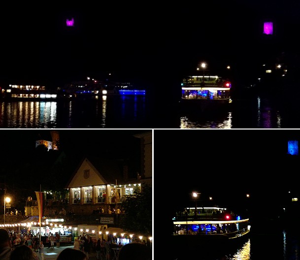 Für die Ehrengäste stand in Neckarsteinach die „Merian“ bereit, an deren Bord sie in der Abenddämmerung zunächst flussabwärts bis hinter Neckargemünd fuhren. Hartmut Quiring unterhielt dabei auf Akkordeon und Saxophon. Nach der Rückkehr begann gleich das Ballonglühen, vom Verein Ballonfahrt Kurpfalz organisiert. Die vier Burgen gaben danach im LED-Licht ein herrliches buntes Bild ab, wie sie sich Grün, Blau, Hell und Lila färbten. Das Fest war aber noch lange nicht beendet. Erst in den frühen Morgenstunden gingen nach einer lauschigen Nacht die letzten Gäste nach Hause.