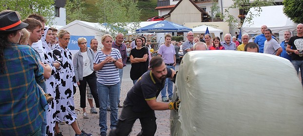 Zum anschließenden traditionellen Heuballenschubsen meldeten sich immerhin fünf Männer- und vier Frauenteams. Der Wettkampf versprach, spannend zu werden. Man begab sich also auf den anspruchsvollen Parcours, der den Teilnehmern nicht nur Kraft, sondern auch Schnelligkeit und Geschick abverlangte. Die langjährigen Titelverteidiger wurden von Michael Walz, Nico Haas und Florian Fülöp enthront. Auf dem zweiten Platz folgte das Team „Blaskapelle“ (Torsten Johann, Torsten Frais, Philipp Riesinger) gefolgt vom drittplatzierten Team aus Rothenberg (Kai Wagner, Dominik Seip, Klaus Bulling), die im Übrigen ihre Teilnahme für das nächste Jahr bereits zusagten. Den Preis für das beste Aussehen beim Wettbewerb erhielten Annette Weyrauch, Isa Leutz, Marina Dewald-Krämer und Sylvie Sauerborn.