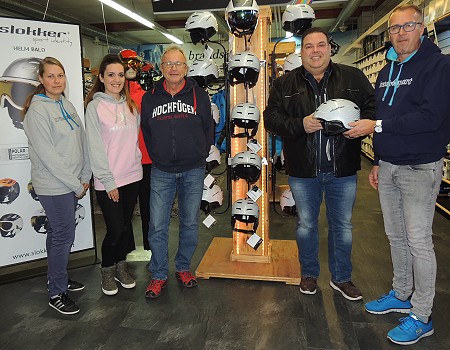 15 hochwertige Skihelme für die Skifreizeit Nancy Nintscheff, Carolin Thöne, Richard Wurm, Udo Geilsdörfer und Rainer Wäsch. (Foto: Ellen Wartner)(bro) (ug) Rainer Wäsch vom Sportartikelgeschäft "Brands4Sport" überreichte kürzlich 15 hochwertige Skihelme an den Schulleiter Udo Geilsdörfer und den ehemaligen Konrektor der Gemeinschaftsschule Eberbach, Richard Wurm.