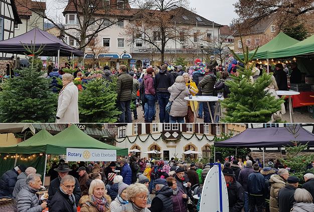 Der Rotary-Club verköstigte mit Bratwürsten vom Grill, Waffeln und diversen Kuchen auch in diesem Jahr wieder die Gäste. Kalte und warme Getränke wie Glühwein und Kaffee waren heiß begehrt. In diesem Jahr bestand auch die Möglichkeit, Bäume gegen eine kleine Spende im Raum Eberbach zustellen zu lassen.