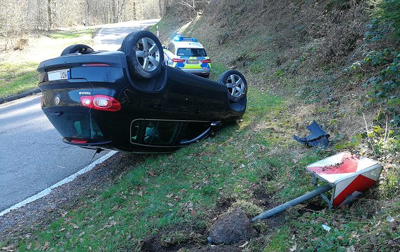 Der Mann war kurz nach 10 Uhr in einem VW Tiguan auf der K 4113 von Gaimühle in Richtung Waldkatzenbach unterwegs. In der scharfen Linkskurve oberhalb von Gaimühle geriet er nach rechts von der Fahrbahn ab, überfuhr ein niedriges Straßenschild und stieß gegen die bergseitige Böschung. Anschließend kippte der Pkw nach links und blieb schließlich auf dem Dach liegen.