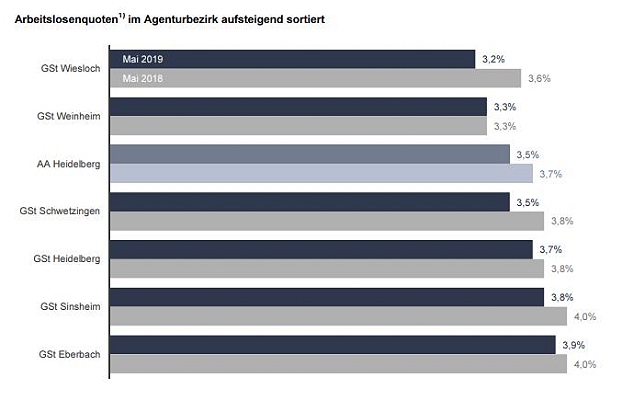 Die Arbeitslosigkeit ist weiterhin niedrig  Arbeitslosenquoten im Mai. (Quelle: Bundesagentur für Arbeit)(bro) (ag) Wie die Agentur für Arbeit in Heidelberg meldete, belief sich die Arbeitslosenquote im Geschäftsstellenbezirk Eberbach im Mai auf 3,9 Prozent. Vor einem Jahr hatte sie 4,0 Prozent betragen.