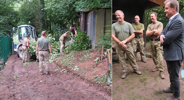 Gemeinnützige Arbeiten in Eberbach und Umgebung Bürgermeister Peter Reichert (r.) besuchte heute die Soldatengruppe bei Vorarbeiten für den Waldkindergarten am Ohrsberg. (Fotos: Claudia Richter)(cr) Britische Soldaten der 23. "Amphibious Engineer Troup" erledigen seit Montag letzter Woche gemeinnützige Arbeiten im Bereich der Stadt Eberbach und in Hirschhorn. Heute besuchte Eberbachs Bürgermeister Peter Reichert die Truppe, die die Vorarbeiten für den Waldkindergarten am Ohrsberg erledigt.