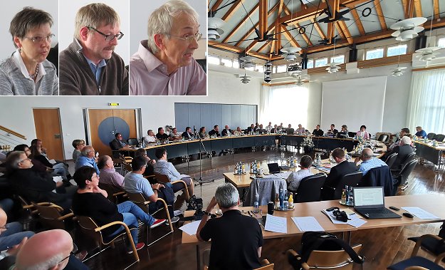 Bürgermeister Reichert will die Bürger trotzdem entscheiden lassen - aber erst später Links oben die Vertrauenspersonen Claudia Kaiser, Rainer Olbert und Lothar Jost bei ihren Statements. (Fotos: Claudia Richter/Hubert Richter)(hr) Eine Entscheidung von weitreichender Bedeutung hatte heute der Eberbacher Gemeinderat zu treffen. In öffentlicher Sitzung ging es um die Frage, ob die Bürgerinnen und Bürger in direkter Demokratie über das Thema Windenergie entscheiden dürfen. Rund 1.200 Eberbacherinnen und Eberbacher hatten einen solchen Bürgerentscheid im Rahmen eines Bürgerbegehrens mit ihren gesammelten Unterschriften beantragt. Die Mehrheit des Gemeinderats erteilte ihnen heute zwar eine Absage, aber Bürgermeister Peter Reichert zeigte einen Weg, wie die Bürger doch noch zu dem Thema entscheiden könnten.