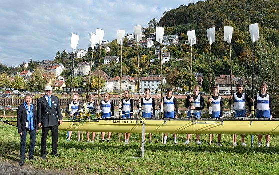 Die ehrenvolle Aufgabe der Bootstaufe kam Frank Günder zuteil, der sich seit über zwei Jahrzehnten um die RGE und deren Ruderbetrieb verdient macht und maßgeblichen Anteil an der Anschaffung dieses Achters hatte. Er taufte den Achter traditionsgemäß auf den Namen „Blauer Hut“. In seiner Taufrede gab er einen Abriss über die langjährige Achterrudertradition der RGE, die 1967 in einem Leihboot mit drei Regattasiegen begann und 1980 mit vielen, von den damaligen Organisatoren in einem Büchlein exakt dokumentierten Ausfahrten, fortgeführt wurde. Sie erlebte ihre Renaissance im Jahr 2018, als die Juniorenmannschaft beschloss, auf den Landesmeisterschaften im Achterrennen zu starten. Hierfür wurde im bis dato vorhandenen Holzboot trainiert und prompt holten die Junioren in einem geliehenen Boot des Landesruderverbandes in einem 8-Boote-Feld den Vizelandesmeistertitel nach Hause. Damit war die Idee geboren, einen gebrauchten, rennfähigen Achter zu erwerben und wurde in die Tat umgesetzt.