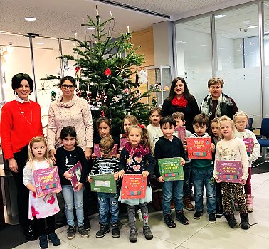 Dieser wurde mit großem Eifer an den Tannenbaum gehängt. Nach dem gemeinsamen Dekorieren und dem Gruppenfoto ging es mit Volksbankmitarbeiterin Marina Milos-Paradzik auf eine kleine Erkundungstour durch die Bank. Selbstverständlich durfte auch ein Blick hinter die große Tresortüre geworfen werden, hinter der ein Schatz versteckt war. Mit neuen Erkenntnissen und einem Geschenk ging es dann zurück in den Kindergarten.