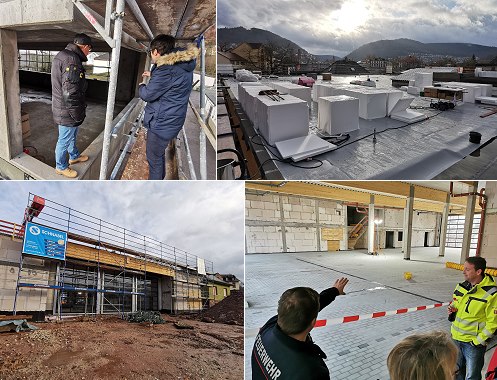 In einem Teil des neuen Anbaus wurde der Estrich samt Rüttelklinkerboden verlegt, der nun noch einige Wochen abbinden muss. Danach, planmäßig am 20. Januar, wird die Feuerwehr-Abteilung Stadt mit dem Großteil ihrer Fahrzeuge schon in den Neubau umziehen können. Ausgerückt wird dann zunächst noch wie bisher über die Güterbahnhofstraße. Die Umbauarbeiten sollen dann in den übrigen Gebäudeteilen, überwiegend im bisherigen Gerätehaus, weitergehen. Nach Fertigstellung des Gesamtgebäudes - voraussichtlich im Herbst 2020 - werden die Feuerwehrfahrzeuge dann im Einsatzfall über den Neuen Weg ausrücken.