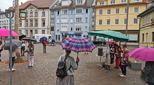 Rechtfertigung für Einschränkung der Grundrechte in Frage gestellt (Foto: Hubert Richter)(hr) Auf dem Neuen Markt in Eberbach gab es heute Nachmittag zum dritten Mal eine “Zusammenkunft für Menschlichkeit und Wahrung der Grundrechte”.