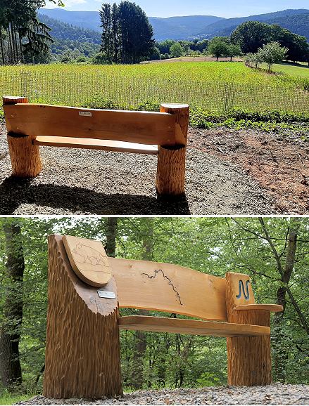 Bänke laden zur Rast auf den Etappen in Eberbach ein Oben: Ausblick vom Tannenkopf u. a. auf den Katzenbuckel, die Burgruine Eberbach, den Breitenstein mit Schollerbuckel, das Frieseneck und den Bocksberg. (Fotos: Stadtverwaltung Eberbach)