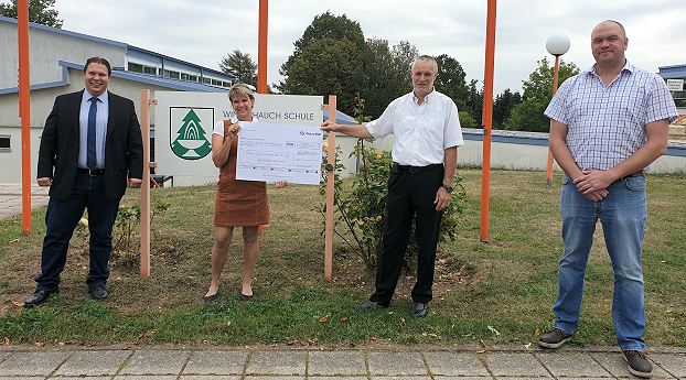 Netze BW plündert Portokasse Annette Pröger und Uwe Weis (2.v.re) freuen sich über den Scheck, den Kommunalberater Sebastian Trumpf (re.) von der Netze BW im Beisein von Bürgermeister Markus Haas (li.) überreichte. (Foto: Hofherr)(hof) Die SG Waldbrunn durfte dieser Tage in Anwesenheit von Bürgermeister Markus Haas eine Spende der Netze BW in Höhe von 688,50 Euro entgegennehmen. Das Unternehmen hat dafür wieder seine Portokasse „geplündert“.