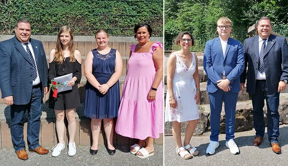 Hauptschulabschlüsse und Mittlere Reife bestanden Links Schulleiter Udo Geilsdörfer mit Lisa-Marie Langer, Fiona Werner und Beate Lemberger (v.l.), rechts mit Stefanie Denner-Götz und Ben Lenz. (Fotos: Claudia Richter)(cr) An der Gemeinschaftsschule Eberbach (GMS) fanden am heutigen Vormittag die Abschlussfeiern zweier Jahrgangsstufen statt. Trotz Corona konnten die Zeugnisse in einem würdigen Rahmen überreicht werden.