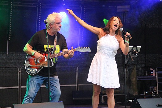 Endlich wieder Festival-Feeling nach langer Zeit  Adax Dörsam und Silke Hauck. (Foto: Thomas Wilken)(tom) Um 20.30 Uhr richtete sich am vergangenen Samstag ein banger Blick nach oben. Kommen jetzt die angekündigten Gewitter und heftigen Schauer? Nein, denn Adax Dörsam und Silke Hauck "bluesten" den Regen weg, der sich breit machen wollte. Nur eine knappe halbe Stunde tröpfelte es mal mehr, mal weniger, dann ging das Kulturfestival „Kohü Open“ wieder seinen normalen Gang. Der künstlerische Leiter Heiko Plank zeigte sich im Nachklapp sehr zufrieden mit dem Ablauf. Die angepeilte Besucherzahl wurde erreicht, auf der Hirschhorner Höhe gab es ein regionales Kulturangebot, das Seinesgleichen sucht.