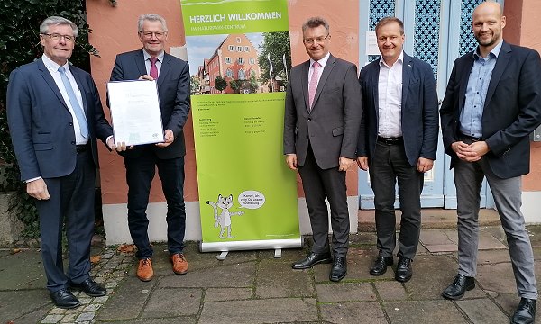 Urkunde in Eberbach überreicht - Blühwiesenprojekt geht weiter V.l. Friedel Heuwinkel, Alois Gerig, Dr. Achim Brötel, Eberbachs Bürgermeister Peter Reichert und Naturpark-Geschäftsführer Paul Siemes. (Foto: Claudia Richter)(cr) (npno) Im Naturparkzentrum in Eberbach wurde dieser Tage der ehemalige Bundestagsabgeordnete Alois Gerig (CDU) mit - pandemiebedingt - zweijähriger Verspätung offiziell zum “Botschafter Naturparke Deutschland” ernannt.