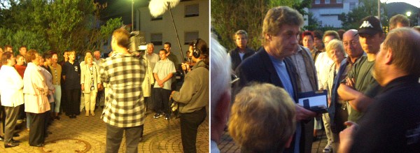 Begrüßungsständchen.HR-Redakteur Lutz Weber beim Interview(Fotos:privat)(tw) (gvh)Am Donnerstag, 11.07.2002, stand der Ortsteil Schöllenbach unserer Gemeinde kurz vor 20.00 Uhr im Mittelpunkt des Interesses des Hessischen Rundfunks. Um diese Uhrzeit wird in der Hessenschau schon seit Jahren in der Aktion „AidA“, die als Abkürzung für „Aufbruch in den Alltag“ steht, ein hessischer Ort mit unter 2000 Einwohnern aus einer Lostrommel gezogen. Diesmal traf das Los Schöllenbach.