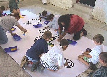 Nachdem von Martin Fuchs, Mehrdad Zaeri und Ute Koch die moderne Bildergeschichte "Adam Elefant" projiziert und vorgelesen worden war, durften die Kinder ihre Eindrücke zu Papier bringen. Juliane Kehm lieferte hierzu das nötige Material. So wurde ein riesiger Bogen Papier ausgelegt und die kleinen Künstler durften mit Tempera-Farben und Pinseln in allen Größen ihrer Phantasie freien Lauf lassen. So entstand am Ende des Nachmittags ein "Riesenbild", das in der Galerie zu sehen sein wird.