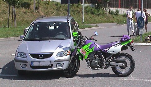 Vorfahrtverletzung - Zusammenstoß mit Motorrad (Foto:Richter)(hr) Insgesamt rund 2.500 Euro Schaden entstand bei einem Verkehrsunfall an der Einmündung der Friedrichsdorfer Landstraße in die L 2311 (Umgehungsstraße). Beim Einbiegen in die Landesstraße übersah ein 56-jähriger PKW-Fahrer aus Mosbach einen von links kommenden Motorradfahrer aus Epfenbach. Beim Crash verkeilte sich die Kawasaki derart im Kotflügel des Mazda, dass sie aufrecht stehenblieb. Der 22-jährige Biker hatte Glück und blieb ebenso wie die Autoinsassen unverletzt.