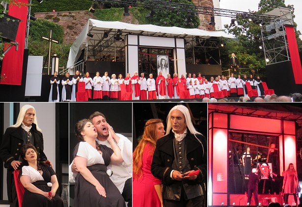 Die letztlich tragische Geschichte um die beiden Liebenden Tosca (Megan Marie Hart) und Cavaradossi (Sebastiano Lo Medico) und ihren finsteren Gegenspieler Polizeichef Scarpia (Marco Di Sapia) im Rahmen kriegerischer Ereignisse im Rom des Jahres 1800 wurde durch Regisseur Sascha Oliver Bauer absolut sehenswert für die Zwingenberger Open-Air-Bühne inszeniert. Das Bühnenbild und die Kostümierung ist konsequent in den Farben Rot, Schwarz und Weiß gehalten, und als Attavanti geistert die Neunkirchener Multi-Künstlerin Jana Kühnle im roten Kleid von Anfang bis Ende durch das Geschehen und greift immer wieder in dieses ein - sichtbar für das Publikum und "unsichtbar" für die handelnden Figuren auf der Bühne. In weiteren Rollen sind Kai Preußker als Angelotti und Sciarrone, Werner Pürling als Meßner und Schließer sowie Holger Ries als Spoletta zu sehen. Die gesanglichen und darstellerischen Leistungen waren gestern durchweg auf sehr hohem Niveau, und das vor rund 600 Zuschauern unter freiem Himmel ohne Mikrofonverstärkung. Besonders brillant und teils mit Szenenapplaus bedacht waren die Darbietungen von Lo Medico und Hart in den Hauptrollen. Letztere war für die eigentlich als Tosca vorgesehene Tatjana Charalgina eingesprungen.