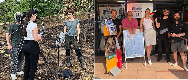 RON-TV und SWR berichten über die Stauferstadt Links: Forstrevierleiterin Christl Hock (r.) spricht mit RON-TV Redakteurin Johanna Scherdel vor laufender Kamera auf der abgebrannten Wiese am Breitenstein über „Wald im Klimawandel“. Rechts: Tobias Soldner (2.v.l.) und Raffael Lutz (l.) mit DĂ©sirĂ©e Kast und ihrem SWR-Team vor der Tourist-Info im Rathaus. (Fotos: Stadt Eberbach)(bro) (stve) Am vergangenen Dienstag waren waren gleich zwei Fernsehsender in Eberbach. Um über das Thema Trockenheit und Waldbrandgefahr zu berichten, hatte sich RON-TV aus Mannheim angesagt. Warum bezeichnet sich Eberbach als das Herz des Neckartals? Dieser Frage wollte das SWR-Fernsehteam aus Mannheim-Ludwigshafen auf den Grund gehen.