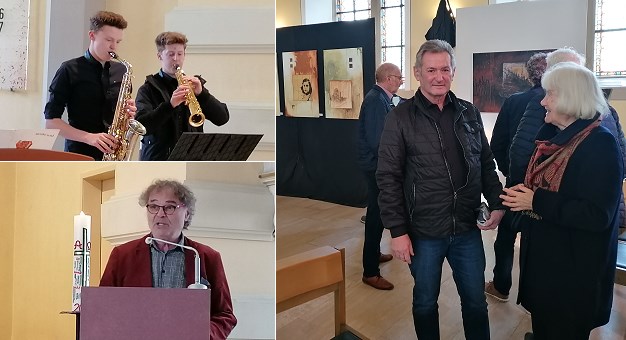 Bernhard Theis, der in die Ausstellung einführte, ging kurz auf den künstlerischen Werdegang Gerstners und seine aus Naturmaterialien geschaffenen Werke ein. In dem Projekt “Verletzte Seele†werden vielfältige Verletzungen an Menschen und Natur in Zusammenhang mit Kriegen und dem Holocaust thematisiert. Die Exponate in der Michaelskirche sprechen für sich, was auch das Ziel des Künstlers war. Er ist der Meinung, wenn das Bild den Maler nicht mehr brauche, beginne die Aufgabe des Betrachters. Theis hat bei der Vernissage, inspiriert durch die Kunstwerke, seine Gedanken zu einzelnen Ausstellungsstücken in berührende Worte gefasst und einige davon vorgetragen. Musikalisch umrahmt wurde die Veranstaltung von Felix und Florian Roh.