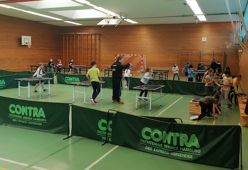 Die Schülerinnen und Schüler der vierten Klassen und des SBBZ (Sonderpädagogischen Bildungs- und Beratungszentrums mit Förderschwerpunkt Lernen) konnten sich an verschiedenen Platten erproben. Auch am Tischtennisroboter konnte trainiert werden. Dieser übte auf alle Kinder eine große Faszination aus.