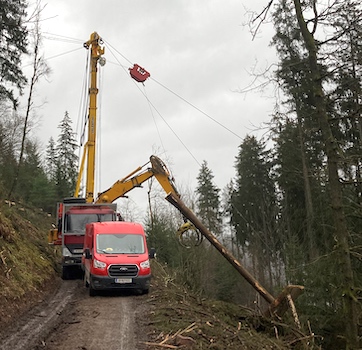 Am 20. Januar Besichtigung der Arbeiten möglich Ein Valentini-Seilkran im Einsatz mit einer Fichte an der Laufkatze, die gerade von dem dahinter stehenden Bagger mit dem Greifer aus dem Seil genommen wird. (Foto: Stadt Eberbach)(bro) (stve) Die Arbeiten im Wald zwischen Eberbach und Rockenau schreiten voran. Inzwischen sind zwei Seilkräne im Einsatz, und das Waldbild hat sich bereits deutlich verändert. Die Stadtförsterei lädt interessierte Bürgerinnen und Bürger zu einer geführten Waldbegehung am Freitag, 20. Januar, um 15 Uhr ein.