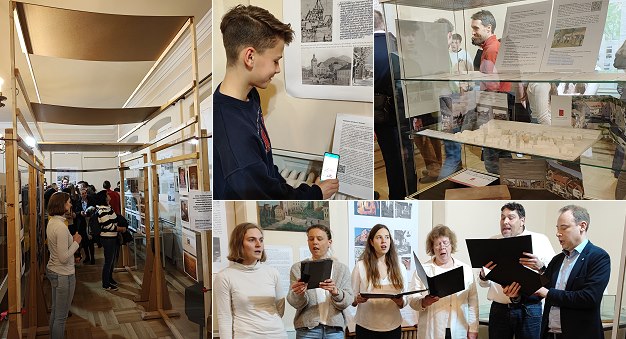 Die Ausstellung, die unter der Projektleitung des HSG-Lehrers Till Weidenhammer erarbeitet wurde, wurde im Beisein der Schülerinnen und Schüler (7. und 8. Klasse) sowie geladener Gäste durch Bürgermeister Peter Reichert am Mittwoch, 8. März, eröffnet, musikalisch umrahmt vom kurzfristig ins Leben gerufenen Chor "StimmBand Eberbach" (Bild rechts unten).